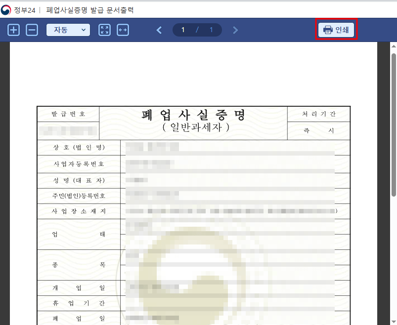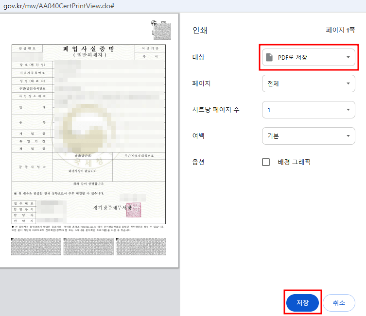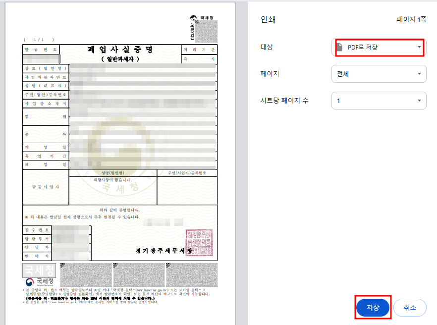 사실 폐업신고 할때 세무서에서 발급받는것이 제일빠릅니다. 하지만 저는 희망리턴패키지 철거비 지원사업의 신청절차를 미리 확인하지 않아서 그냥 폐업신고만 하고 왔기때문에 인터넷으로 발급받아야 했습니다. 세무서에서 발급 받았더라도 파일로 업로드 하려면 스캔하거나 사진찍어서 첨부해야 했겠죠. 세무서를 직접 방문하지 않아도, 홈택스나 정부24에서 온라인으로 손쉽게 발급이 가능합니다. 다만 주의할 점은 PDF 파일로 저장하려면 출력 단계에서 '인쇄→PDF 저장' 과정을 거쳐야 한다는 것입니다.