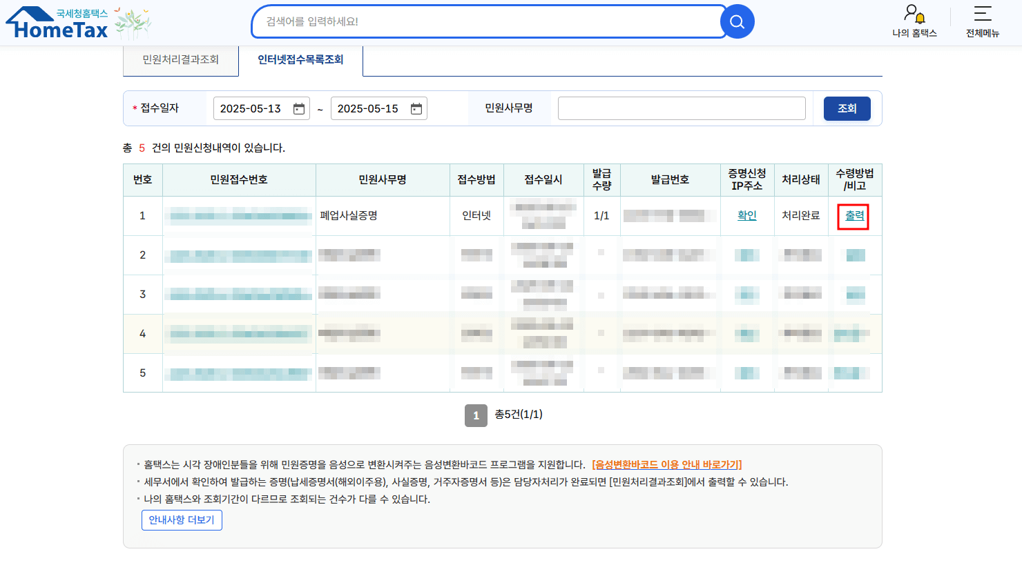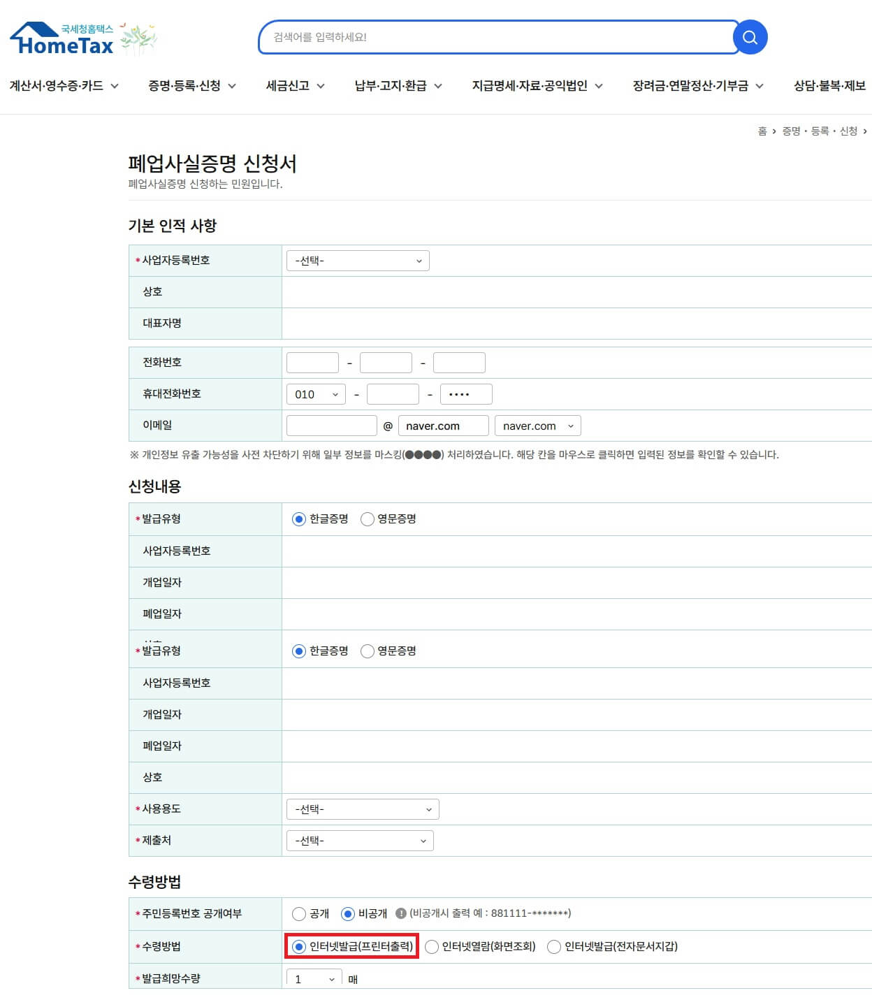 - 사업자 등록번호 입력후 신청서류 작성 → 수령방법에서 인터넷발급(프린터출력) 선택후 신청 → 인터넷 접수목록 화면에서 출력 클릭 → 인쇄 클릭