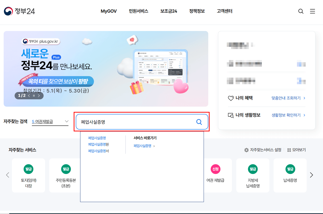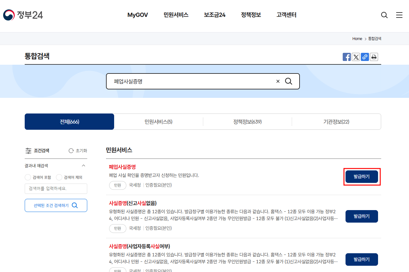 - 통합검색창에 '폐업사실증명' 입력 후 검색 → 발급하기 클릭 → 정보입력