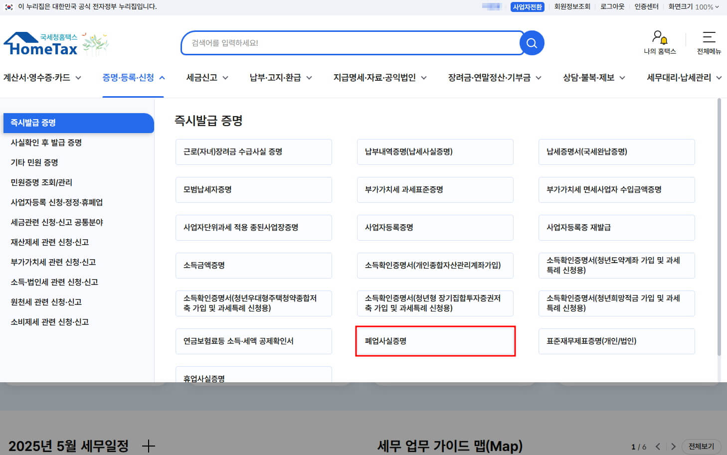 - 임시페이지(5월한정) 맨오른쪽 홈택스 바로가기 클릭 → 로그인 → 상단 카테고리에서 증명ㆍ등록ㆍ신청 클릭 → 폐업사실증명 클릭