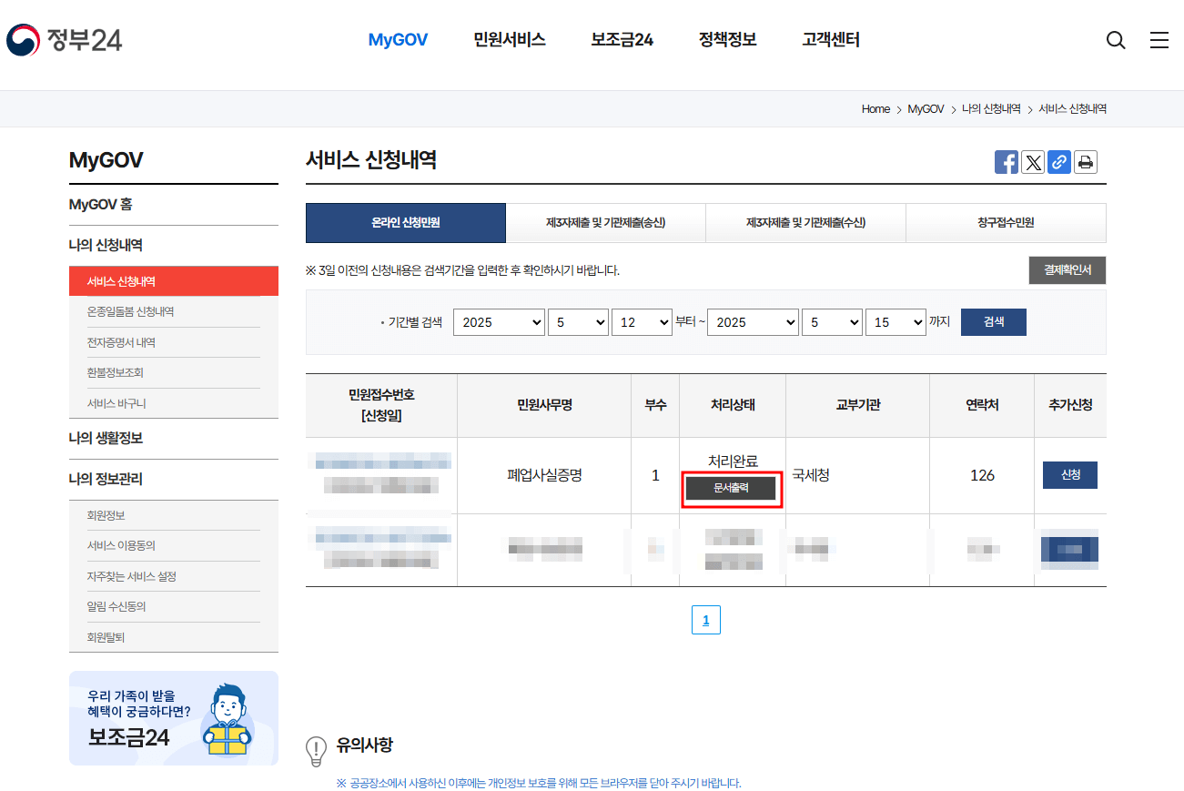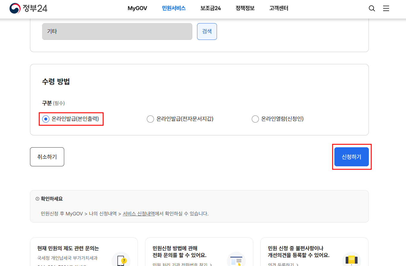- 수령방법에서 온라인발급(본인출력) 선택후 신청 → 서비스 신청내역 화면에서 문서출력 클릭 → 인쇄 클릭