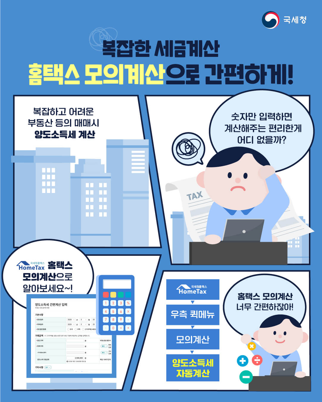 #홈택스활용법 #세금미리계산 #양도소득세시뮬레이션 #연말정산예상금액 #증여세자동계산 #퇴직소득세예상 #종합부동산세 #주택임대소득분리과세 #국세청모의계산 #세금계획팁